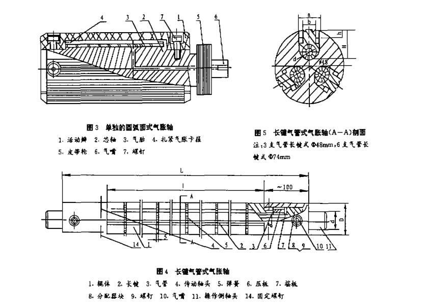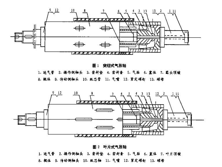 | 氣脹軸的種類、 結構與制造 在軸式卷紙機、分切機、印刷機等設備中收放軸采用方芯軸一直延用至今,且使用面較廣。但僅適用于低速,卷放質量不高,裝卸勞動強度太,又不安全。在這個基礎上發展了兩種機械伸脹軸,一種是分韌機的放紙軸.另一種是縱切復卷機的卷芯軸,結構較為合理,制造較精確,但難度大.勞動強度也較大。 近年來.國內外設備上收放裝置中采用新結構的氣脹軸漸多.我們進行摸索、試制.受到使用單位的好評。現把氣脹軸的結構作一介紹,讓更多機械廠、使用廠提高對它的認識和了解.便于制造、更新與推廣。 1 氣脹軸的種類 氣脹軸從結構上來說,到 目前為止可分為三太類:第一類.用于收放卷的普通型,如圖1、圖2、圖3所示。第二類.用于較高要求收卷中,如圖4、圖5所示 第三類,用于特殊要求中,如圖6 所示2 1.1 突鈕式(圓柱頭為滑塊)氣脹軸(圖1),葉片式(雙圓頭平鍵為滑塊)氣脹軸(圖2) 第一類圖 1、圖2 中,輥俸通常為無縫鋼管車制,一種輥面鉆有圓孔,另一種為銑制雙圓頭長孔,輥體內裝有氣胎,氣胎外面為 4~6 片金屬條(無璉鋼管銑割而成)分幾段,氣胎兩端用密封套、密封墊.藉螺母收緊把端部封住,有一端裝有氣管、氣嘴。突鈕式圓柱頭或葉片式平鍵均固定在金屬條上,突鈕式的,金屬條鉆圓孔后用銅焊連接,而葉片式平鍵滑塊的,金屬條銑一長凹槽,平鍵滑塊從槽中推進用彈簧片確定其位置.保證平鍵精塊在輥體孔中伸縮移動自如.然后金屬條用銅焊連接 ,為了保證氣胎有較長壽命與惜塊收縮刊最低位置,在氣胎內裝入一支圓柱形輕質棒料(鋁管、硬塑料管、木料),特別在氣胎直徑較大,長度較長,停用時中間部份膠管可防止內壁粘連,過早造成折邊、龜裂。