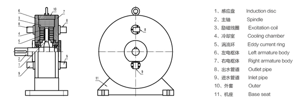當激磁線圈通上直流電時,其產生的磁通經左右電樞體、渦流環、感應盤,形成閉合磁路,有與轉子形狀猶如直齒輪,當感應盤被原動機帶動旋轉時,渦流環內表面產生疏密相間的磁場,該磁場在渦流環的表面上任一點呈交變變化,因此在渦流環內表面及一定深度范圍內產生渦流,由于渦流形成的磁場與原磁場的相互作用,在感應盤上就產生了制動力矩。